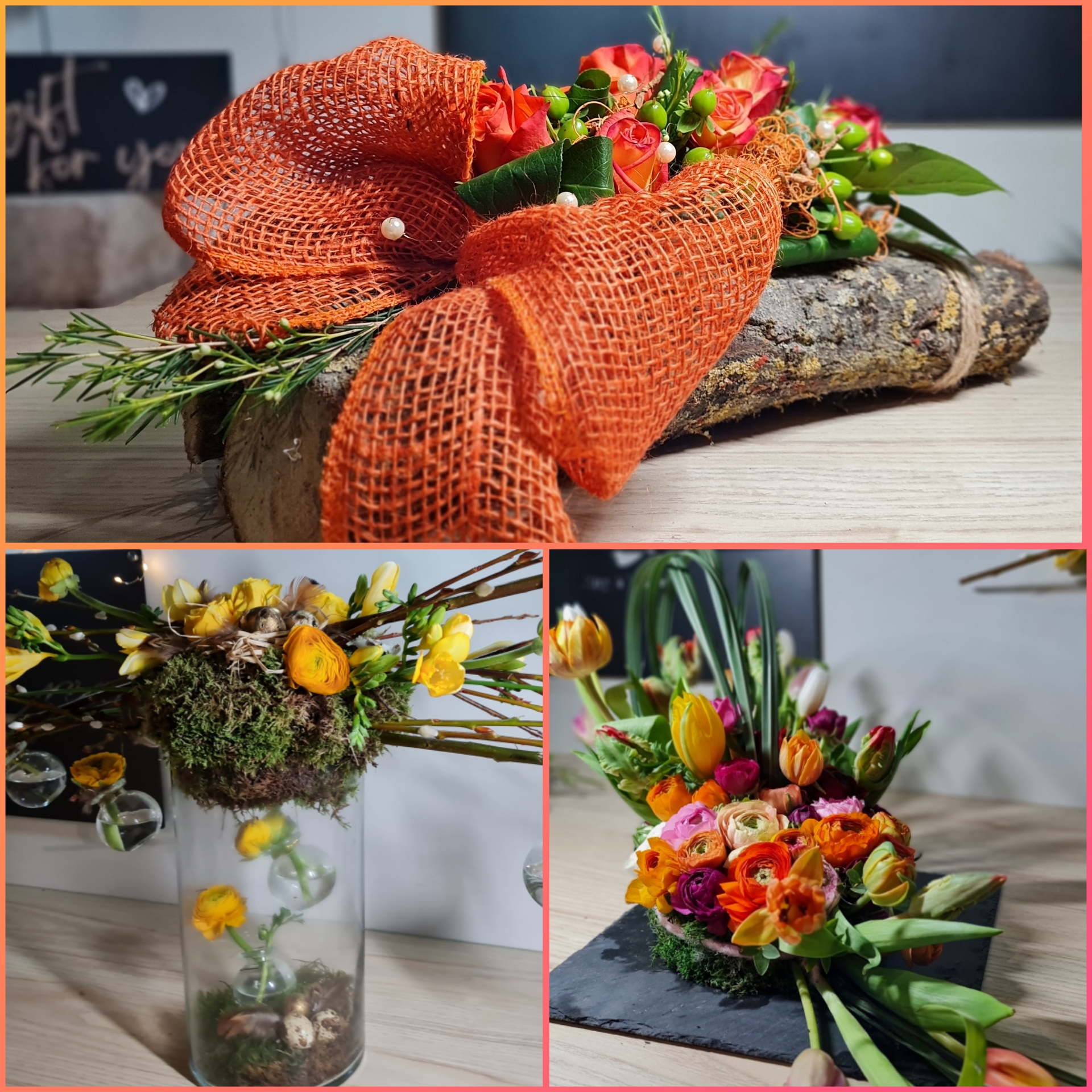 3 bloemen op blok en 2 bloemen op tafel